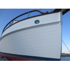 とても広く作られたフライブリッジです。展開しての確認はしていませんが、大き目のオーニング、後部には伝統的なトローラーらしくデリックも装備されています。