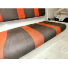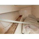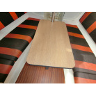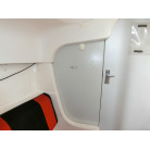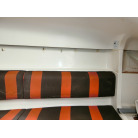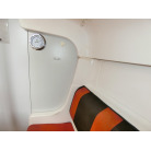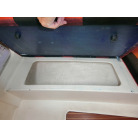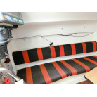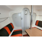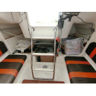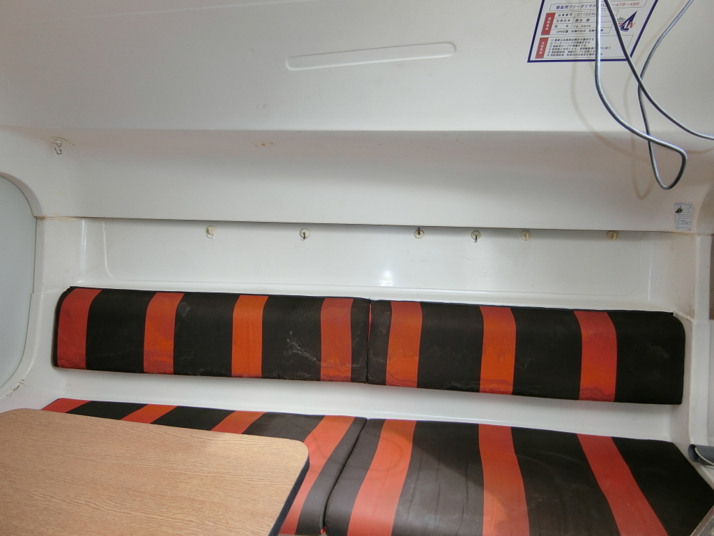 船室内はとてもシンプルで、両舷側のシートにフォールディング式のキャビンテーブル、船尾側に横に寝られ収納としても使える大きなスペースの配置です。