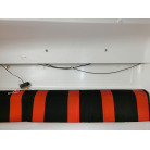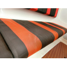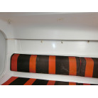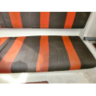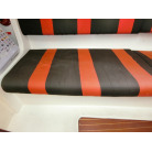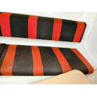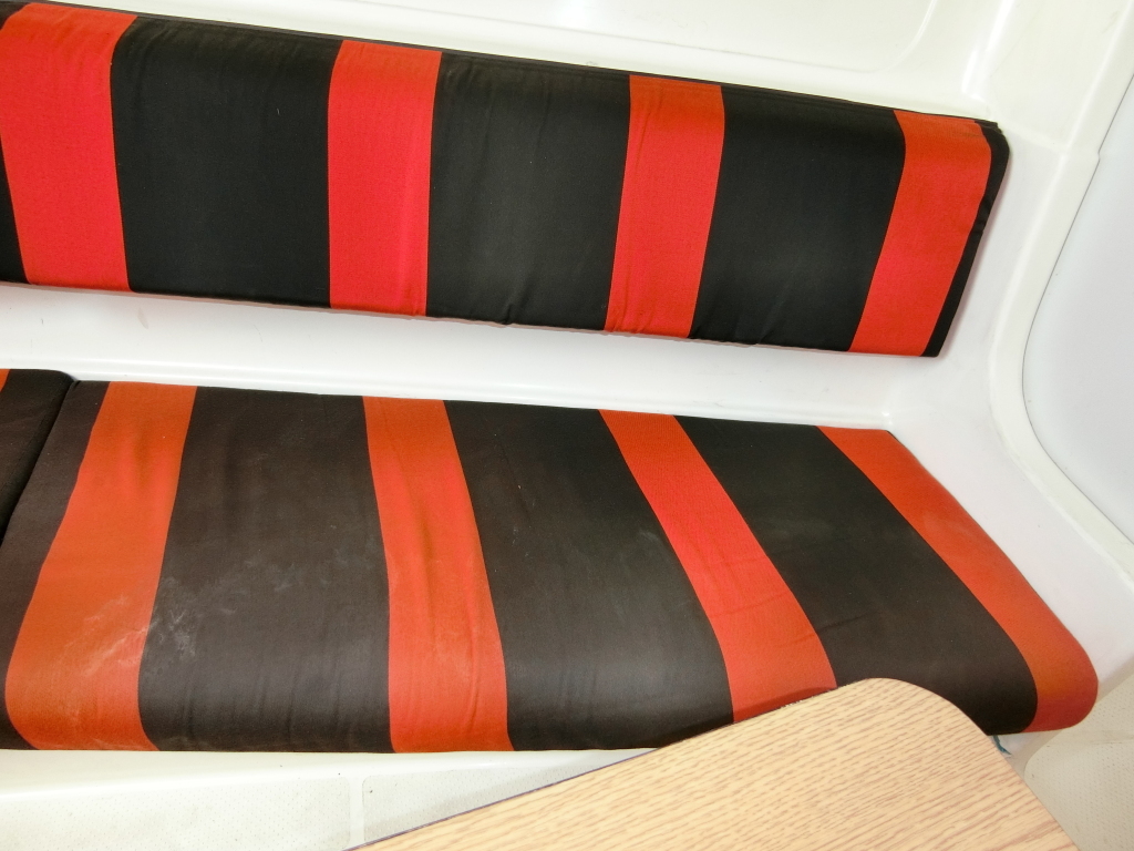 ・赤黒のシートは片側3名座れる程度のベンチシートで、シートの下は収納スペースになっております。