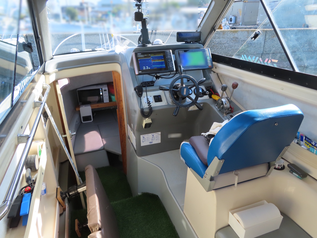 すっきりとした船内の操船パネル上部には、GPS魚探が2基装備されていました。