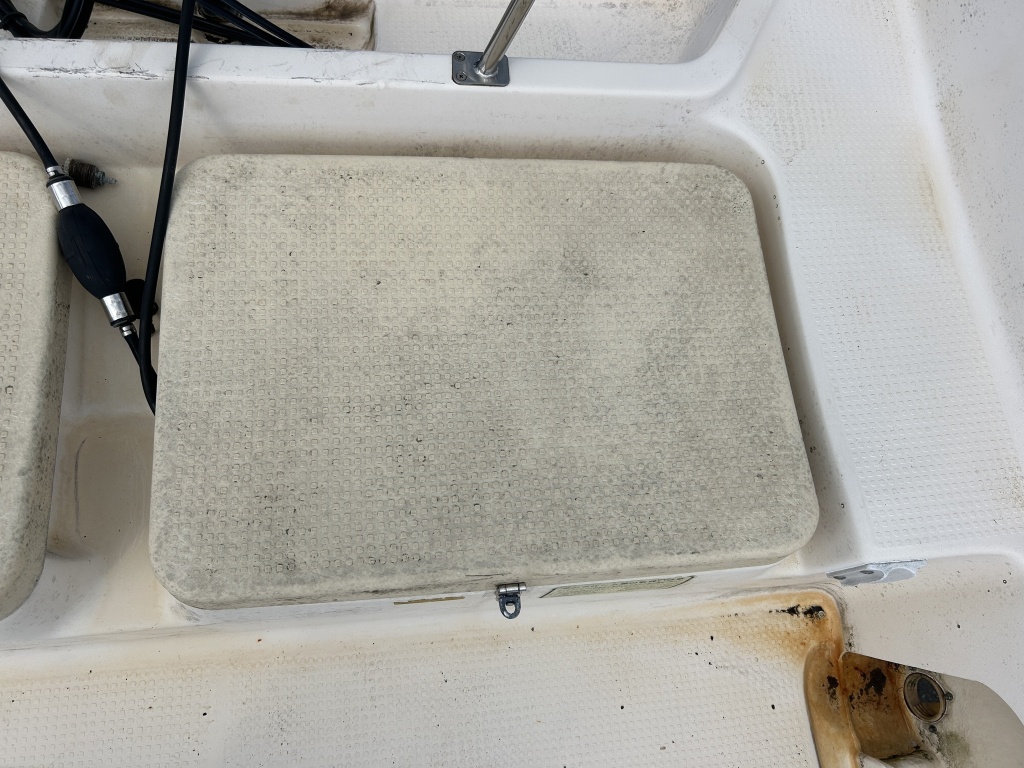 デッキ中央にはイケスを装備、魚探(HONDEX HE-520)やコンパスもあり、フィッシング用途に便利です。