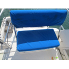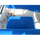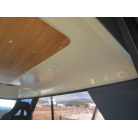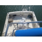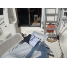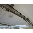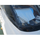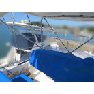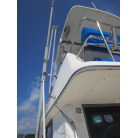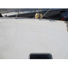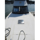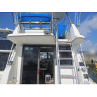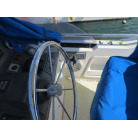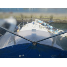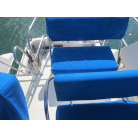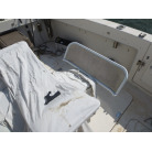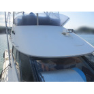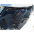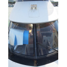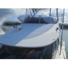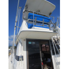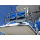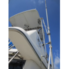 トローリングに必須のフライブリッジ。アッパーでも操船可能です。フロントにはアクリル製の風防が備わっています。またデッキを覆うようなハードオーニングがあるので、強い日差しなどから人員を守ってくれます。