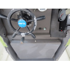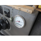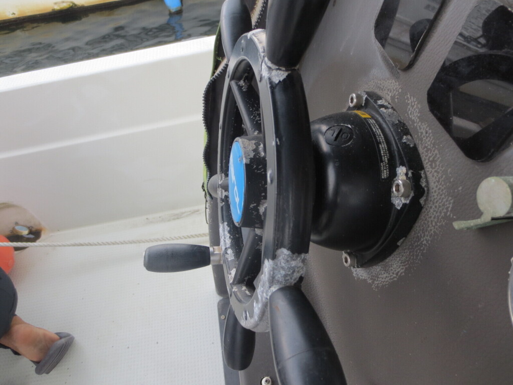 コンパクトなセンターコンソールには大画面のGPS魚探。操舵は油圧のラット式になっています。