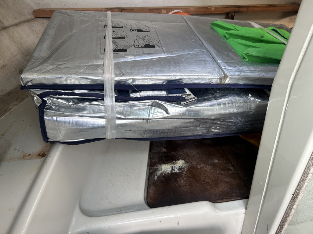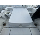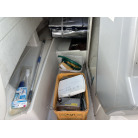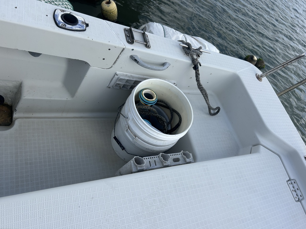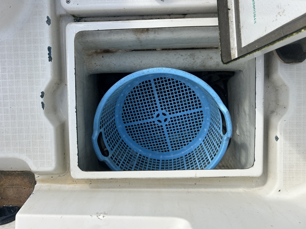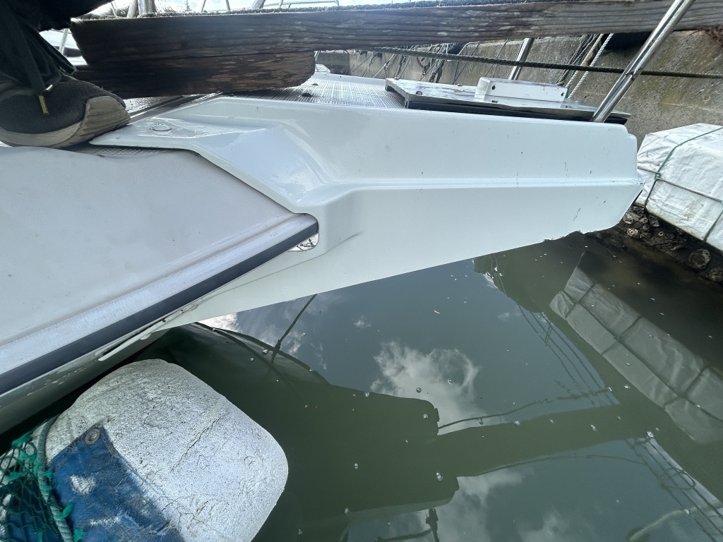 デッキ下には収納スペースがあり、左舷側付近のトップコートに一部ひび割れがありますが、FRP層まで損傷は及んでいません。