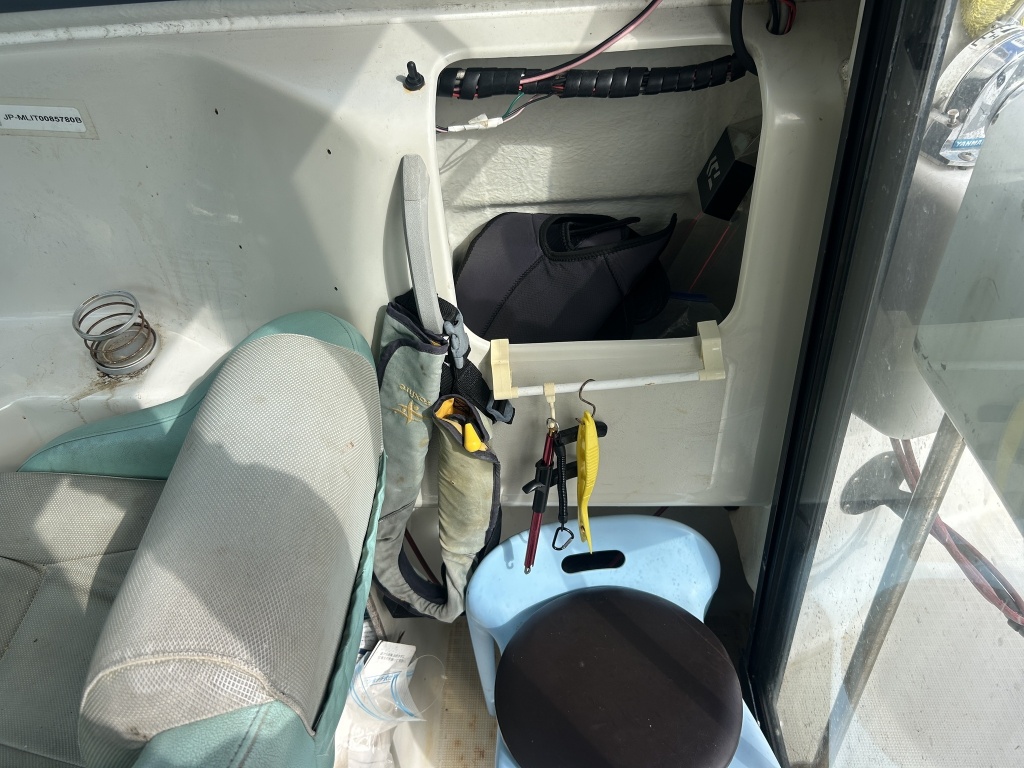 キャビン内には横になれるベッドスペースはありませんが、釣り竿や道具類を置くための収納・作業スペースとして十分な広さがあります。