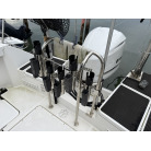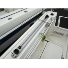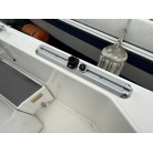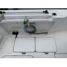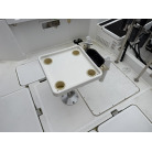 アフトデッキにはテーブルが、船外機付近にはハンドレールにもなる大型のステンレス製のロッドホルダー、ブルワークにはスライド式のロッドホルダーベースが設置されています。