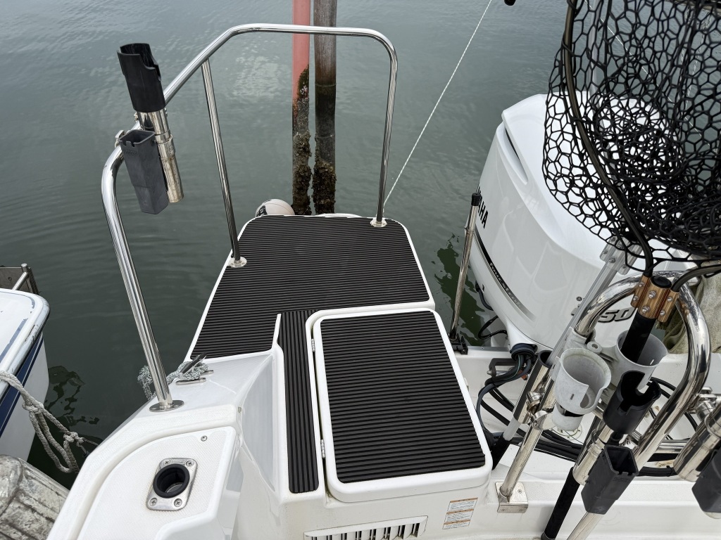 トランサムのデッキスペースには、大型のハンドレールが設置されていますので安心して釣りが出来そうです。