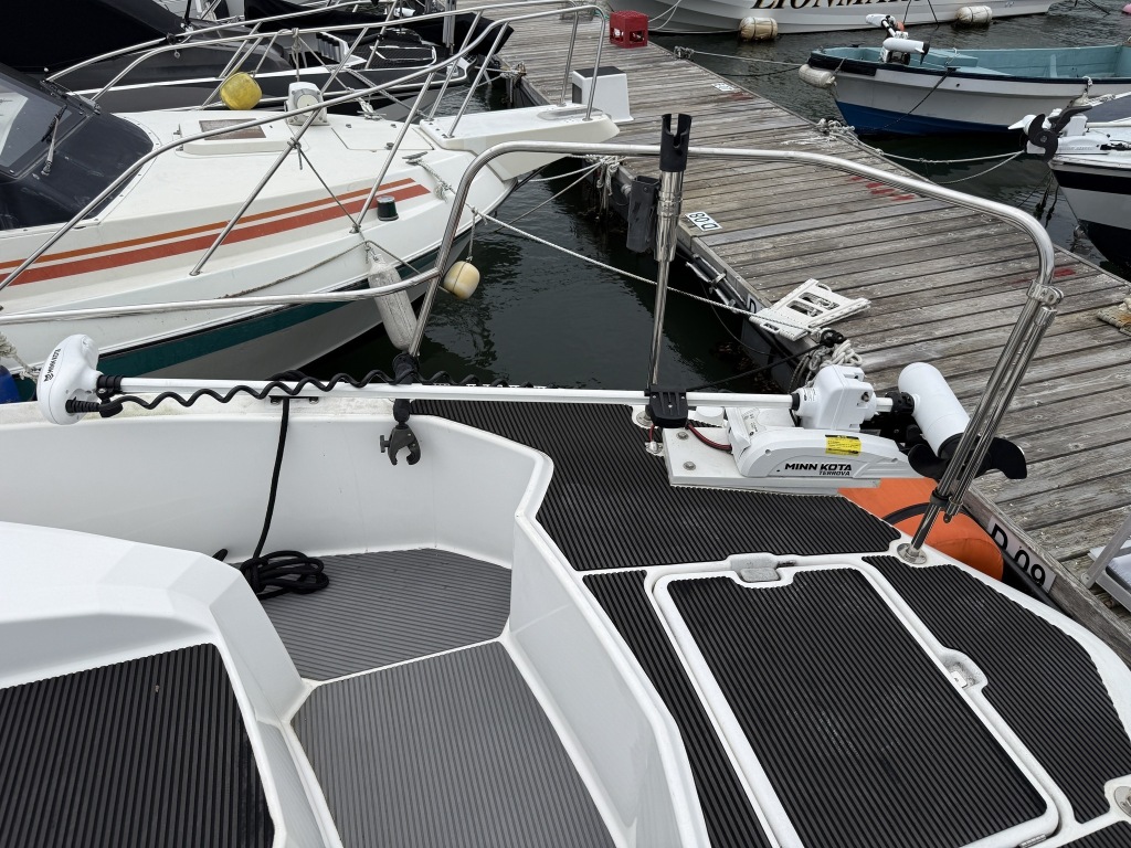 この艇は、ウォークアラウンドタイプでワイドなスクエアバウとトランサムデッキ、広いサイドウォークが備えられているため大人数でも釣りを楽しめそうです。