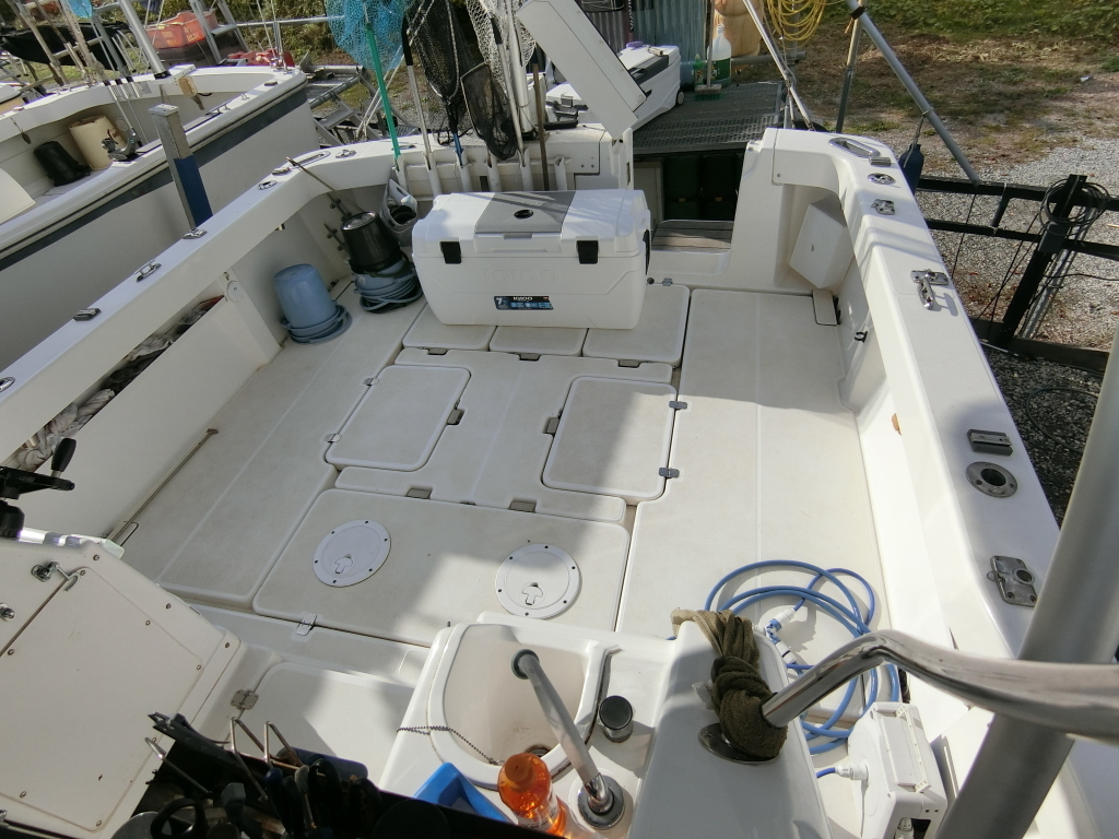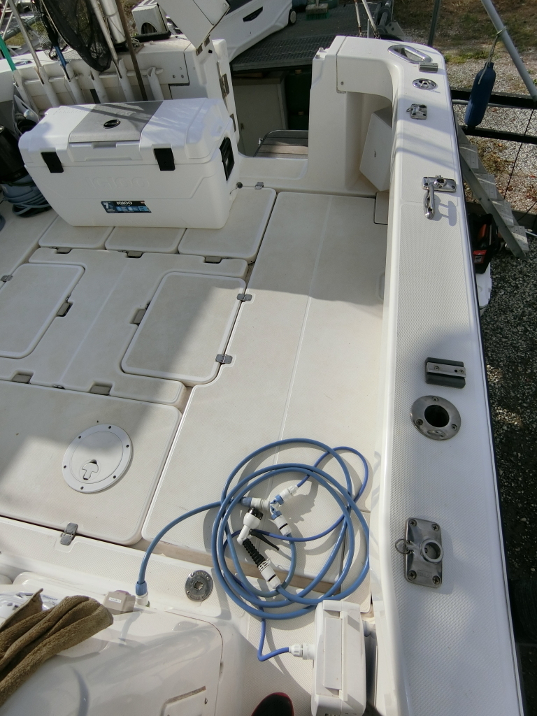 頻繁に釣行されており、デッキ上は全体的に使用に伴う汚れが見られますが、深い傷は無く、FRPの劣化は感じませんでした。