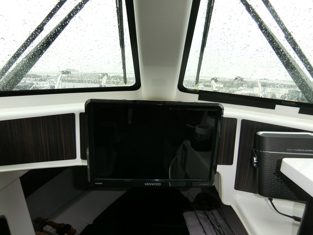 ・操船席周りには、左舷側からレーダー(FURUNO製)、テレビ(10インチ)、魚探(HONDEX製 HDX-12C)、ソナー(HONDEX製 HEー773ⅣーDi)、メインモニター、マリンVHF等が整然と並び、大分気分が盛上がる雰囲気です。