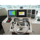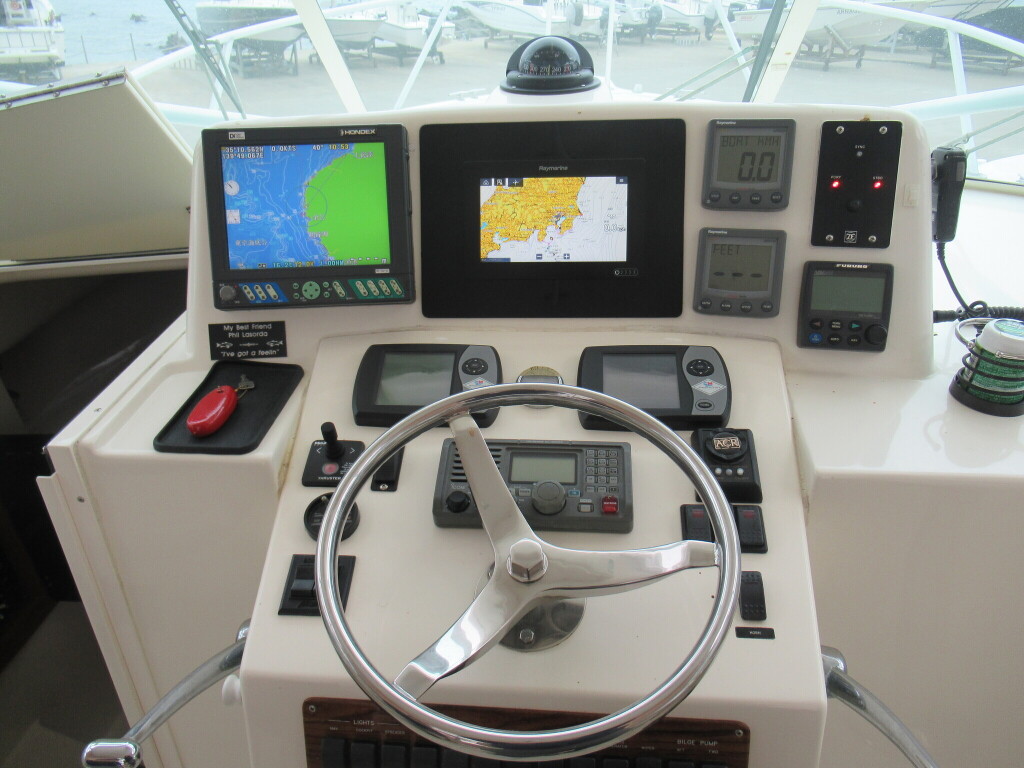 操船席にはGPS魚探、無線、コンパス、オーナーさんが新設されたバウスラスターが装備されております。