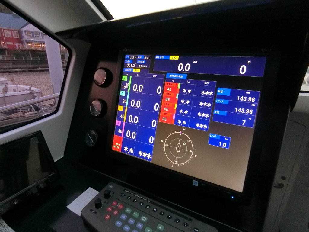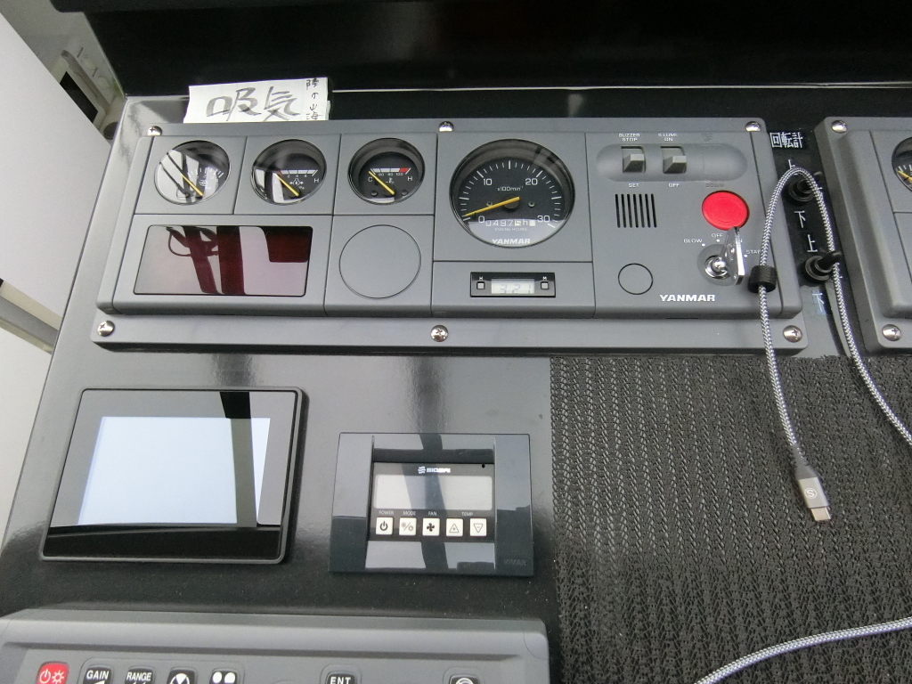 ・操船席周りには左舷席には流速計(JRC製)、右舷席にはメインモニターが3つありレーダー(KODEN製)、電子海図(KODEN製)、魚探(KODEN製)の他にGPS(KODEN製)、マリンVHFを備えています。