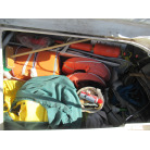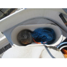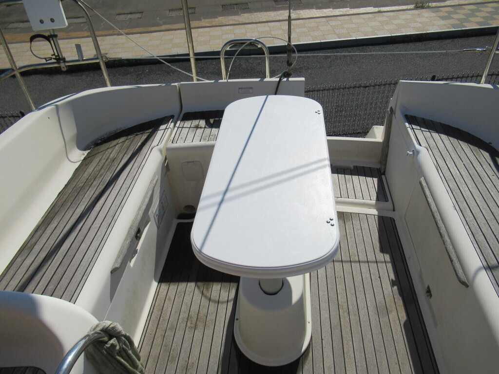 後部デッキ中央にテーブルがあり、両サイドに収納庫があります。左舷側後部にプロパンガスボンベが保管されております。