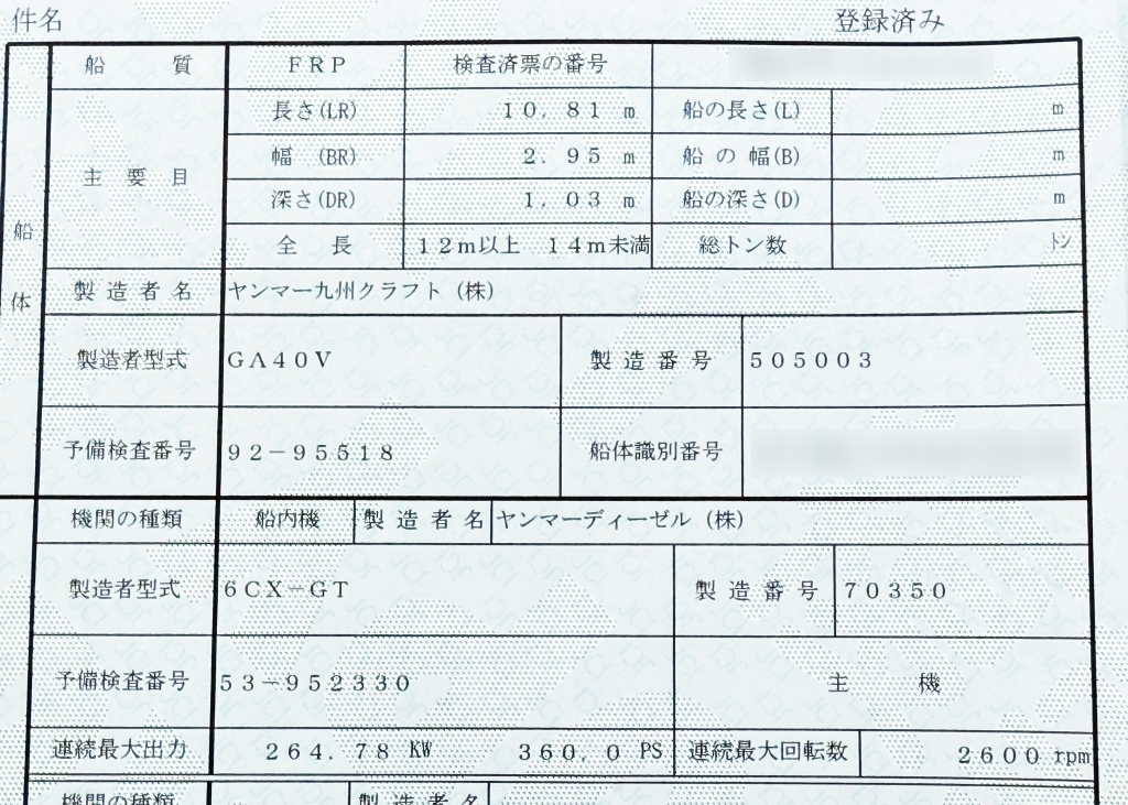 | サイズ(船検証) | 全長:10.81m 全幅:2.95m 全深:1.03m | ||
