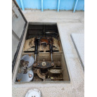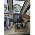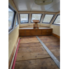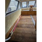 この船の大まかな作りとしては、船体中央部にエンジンがあり、その上に前方室があります。もちろん前方室の後ろが操船席になります。操船席入口には階段を1段上がるような感じです。
