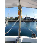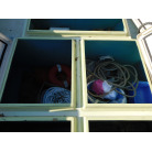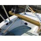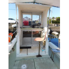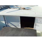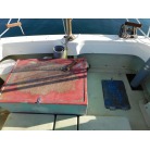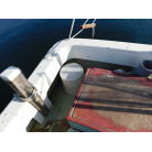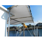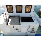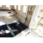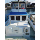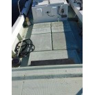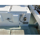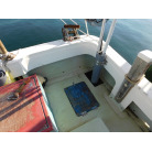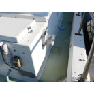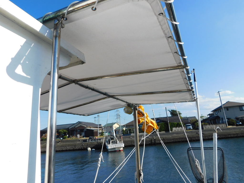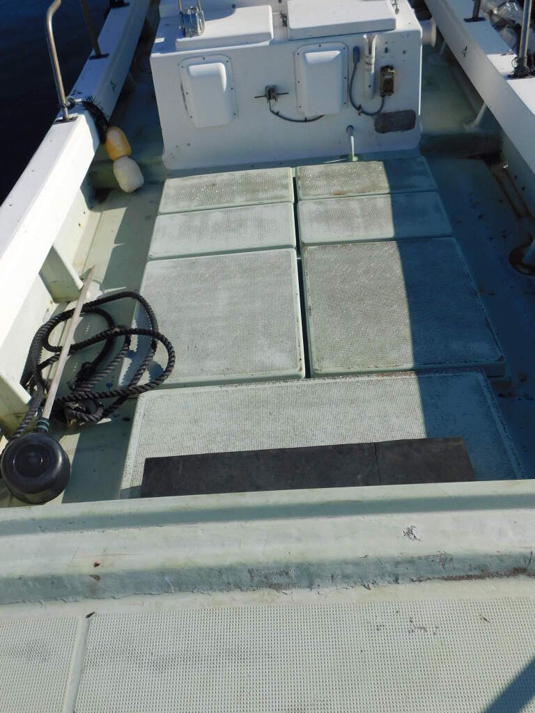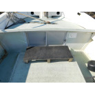 デッキは前後ともに広々としており、床もガンネル周りもしっかりとしています。前デッキには2ステーション(舵リモコン)となっていて、大型イケスも装備されデッキの物入も大型になっています。電動リール電源も前後デッキにあり両方で釣りも作業もできそうです。スパンカーとしっかりとしたオーニングも設置されています。