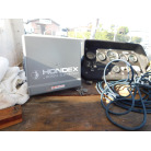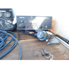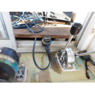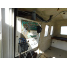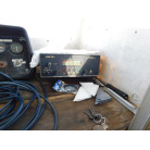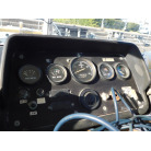 計器類は問題なく作動しているようです。アワーメーターは5600時間と表示されています。電子ラットと舵リモコン、トローリング用の微速クラッチ、HONDEXのGPS魚探も付属します。