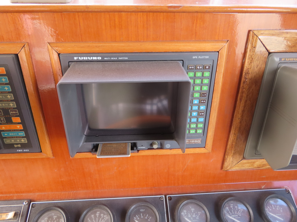 操船席の中央にキャプテンシートがあり、各種メーターや航海計器が装備されています。