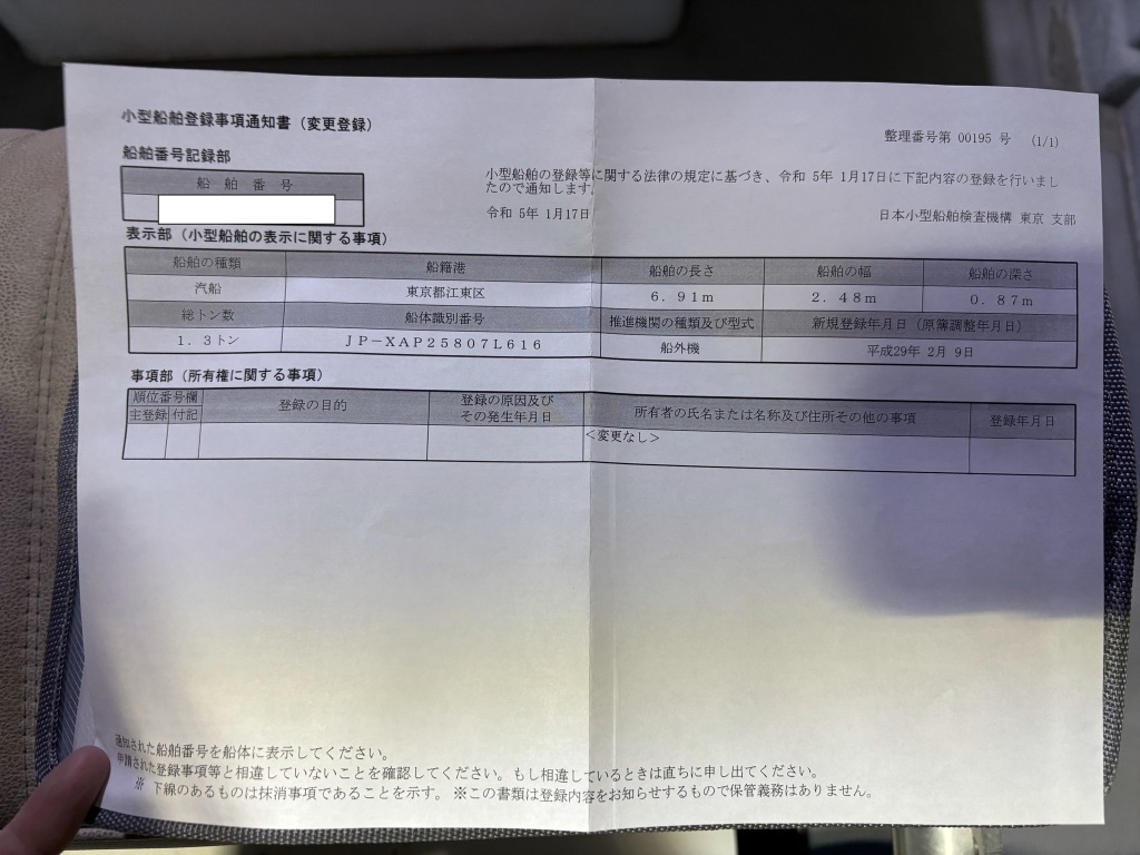 | サイズ(船検証) | 全長:6.91m 全幅:2.48m 全深:0.87m | ||