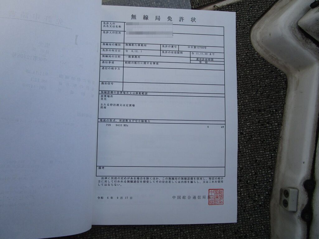 主な装備は① GPS魚探(ヤマハ)②マリンレ-ダ-(フルノ)③サ-チライト④デッキライト⑤トランサムステップ/ラダ-