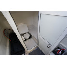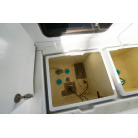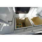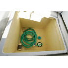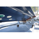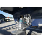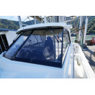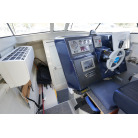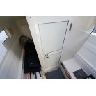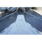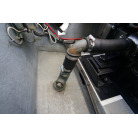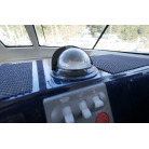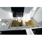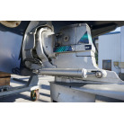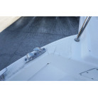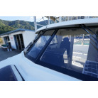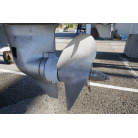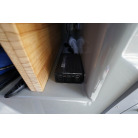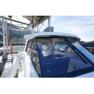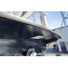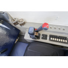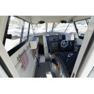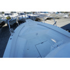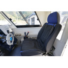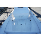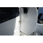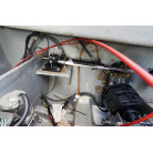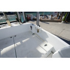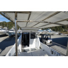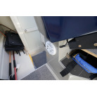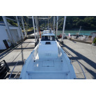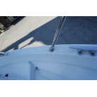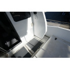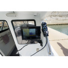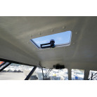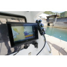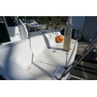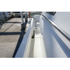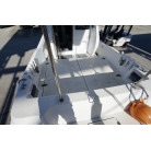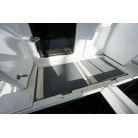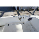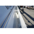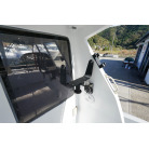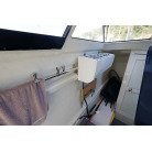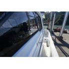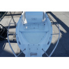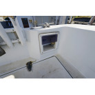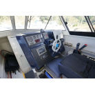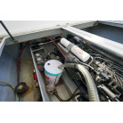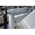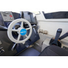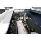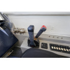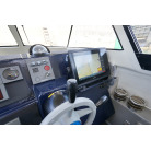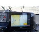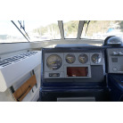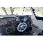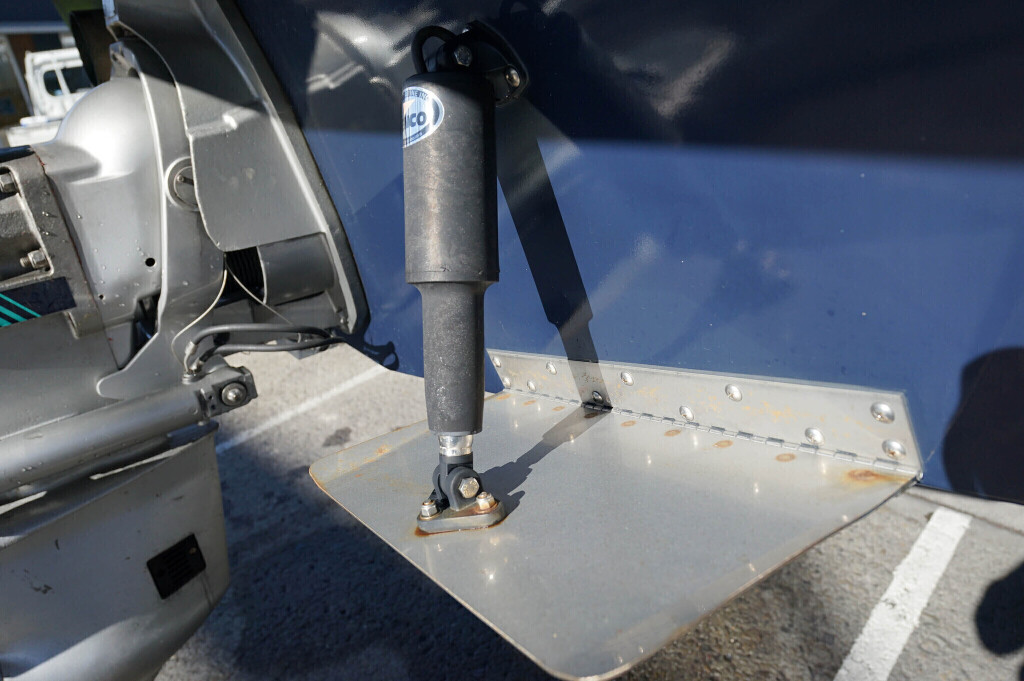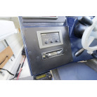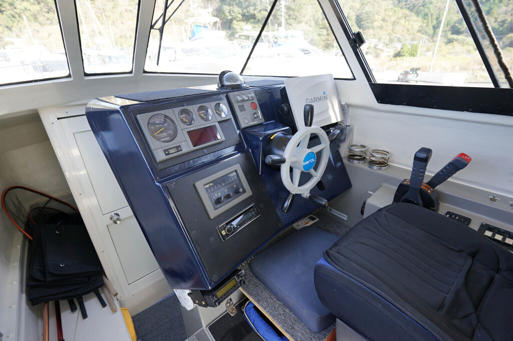操舵パネルのベース部分もハルと同じく紺色で塗装されています。GPS魚探は10インチのGARMIN GPSMAP 7410 XSV。アワメーターは2,989時間を示していますが、2016年の改修時に壊れていたデジタルメーターからアナログメーターに変更したとのことですので、実際の使用時間は不明です。操舵装置はmarolのリモコン付属ですのでアフトデッキからの操船も可能です。コンパスは交換が必要です。