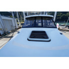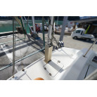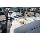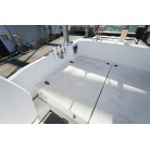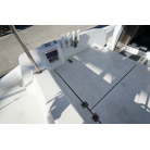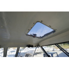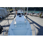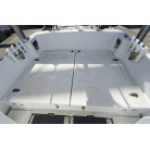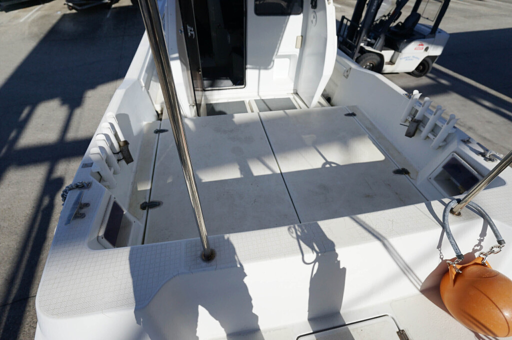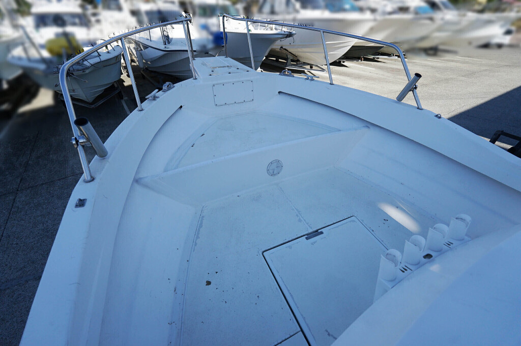 ウォークアラウンド型の32ft艇ですので、デッキは広く前後への移動も楽々です。船齢33年ですので、パルピットの付け根部分などに多数のヘアークラックがありますが船体構造に影響するような大きなクラックはありません。バウデッキの床は少しブカブカしています。おそらく床の下の構造と表面ののFRPの剥離が原因と思われます。現状で使用には問題のないレベルですが、気になる場合はバウ部分の床面の補修が必要です。デッキ床面には全面にノンスリップ塗装がされていますが塗装が劣化している部分もあります。