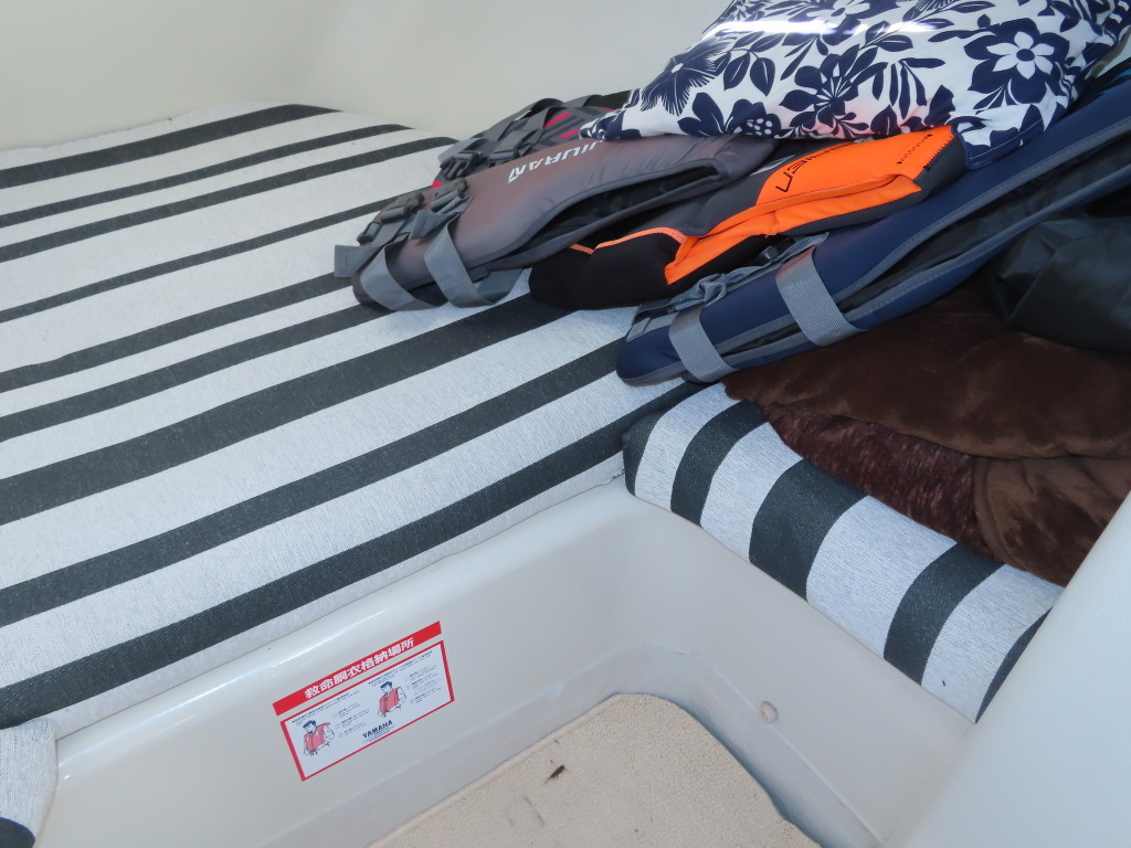 バウバースは、ゆったりとしたスペースがあり、休憩スペースとしてや、収納スペースとして利用出来そうに思えました。バウ側のシートクッションは、シートカバーが付いた状態でしたが、シートカバー全体も綺麗な状態に思えました。