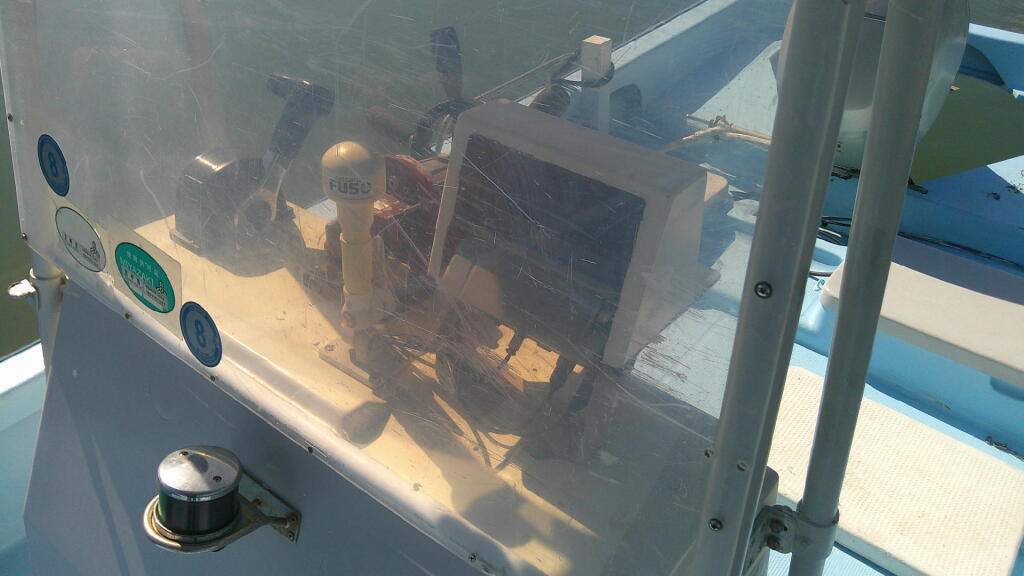センターコンソールがあり、操舵は油圧になっています。アワーメーターが無いため、稼働時間は不明です。