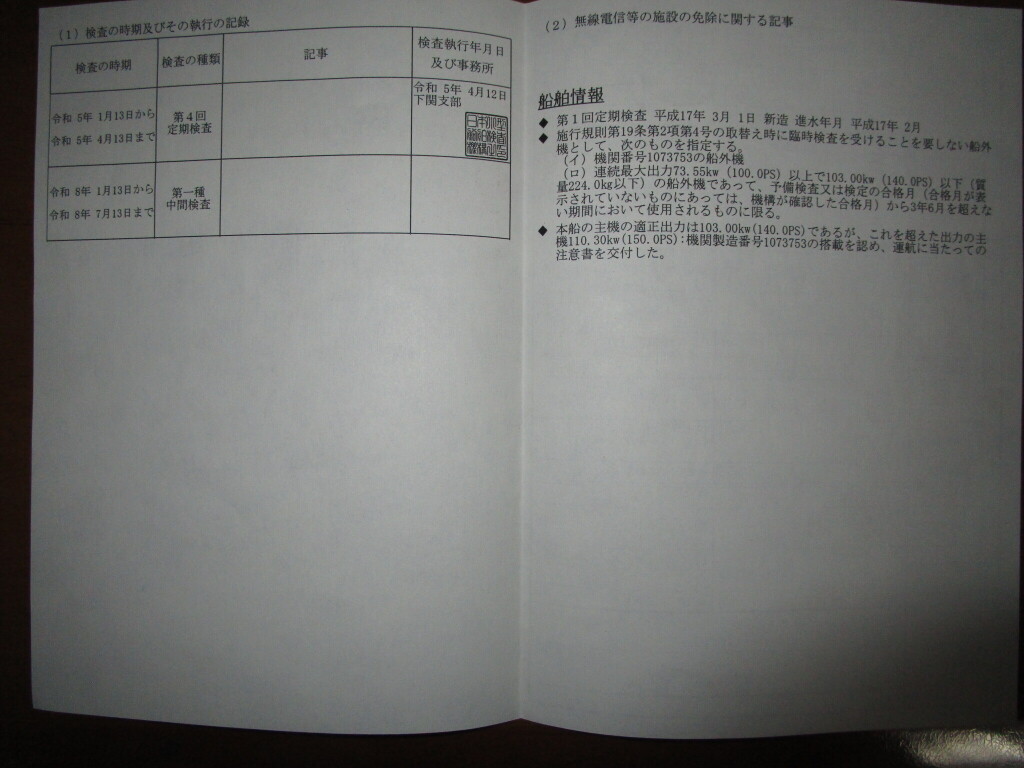 | 船検証記載馬力 | 150馬力 / 5,500rpm(回転数) | 推進機器種類 | 船外機 |