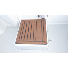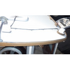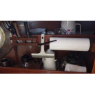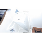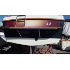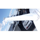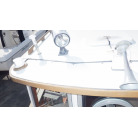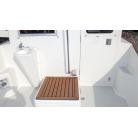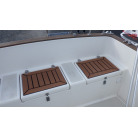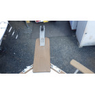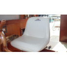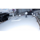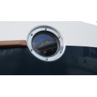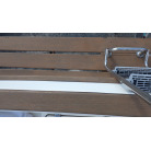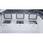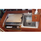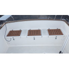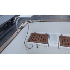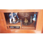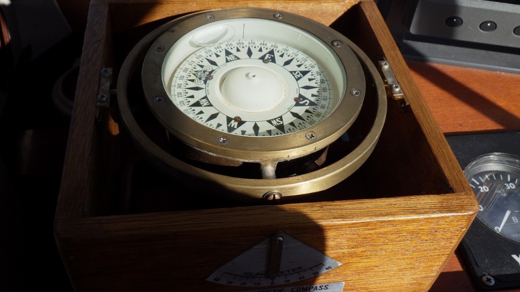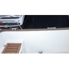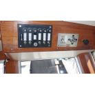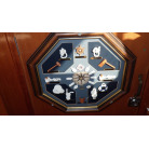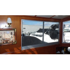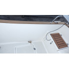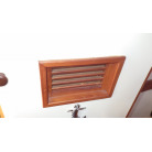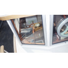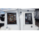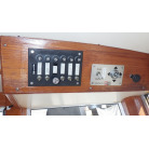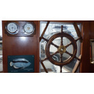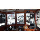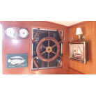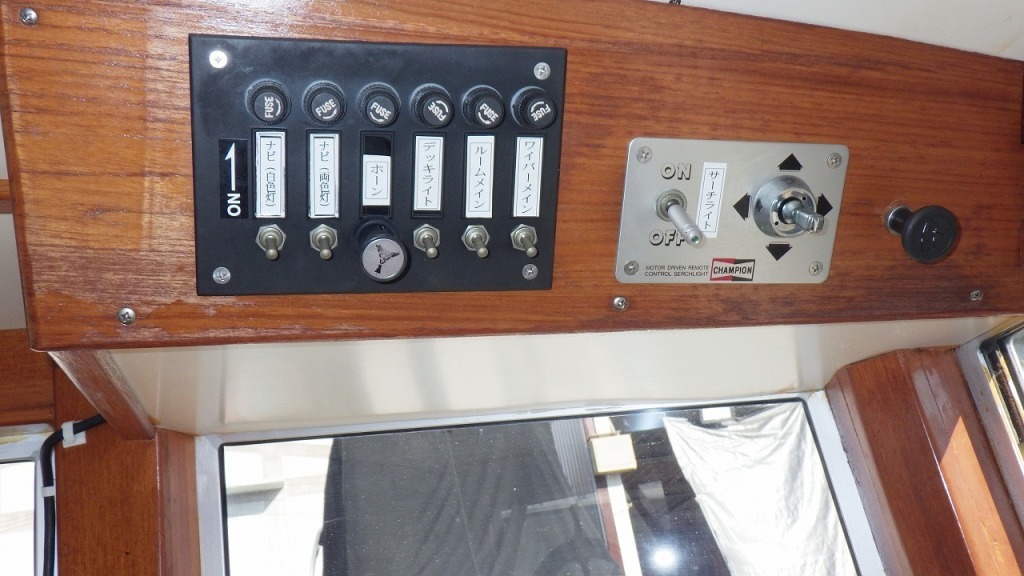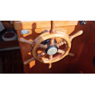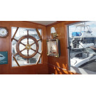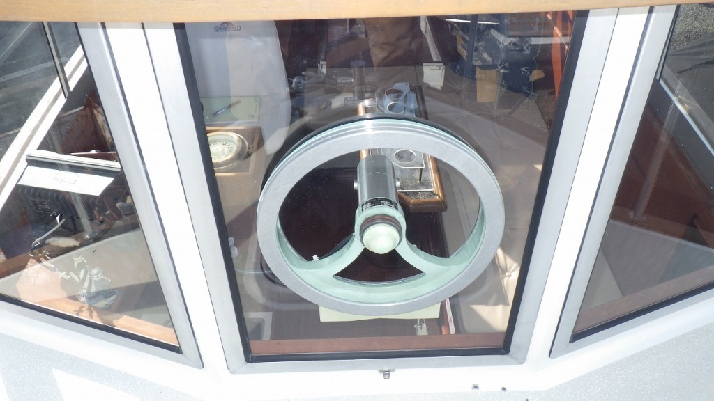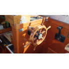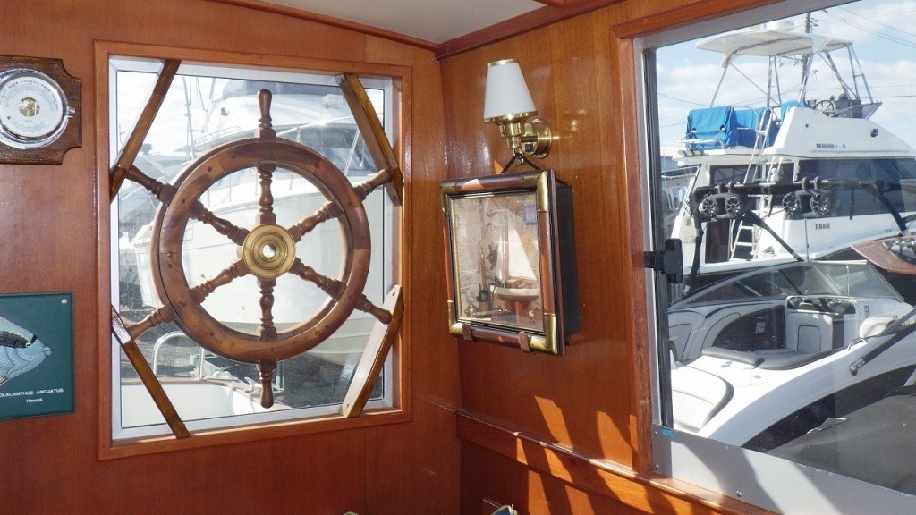 GPS魚探、冷蔵庫、シンク、アルコールバーナーコンロ、トイレ、後部デッキには清水設備が装備され、なんと操舵装置は木製のラットが装備されています。