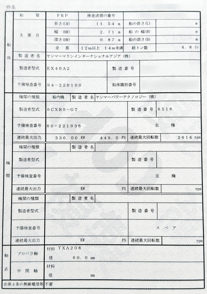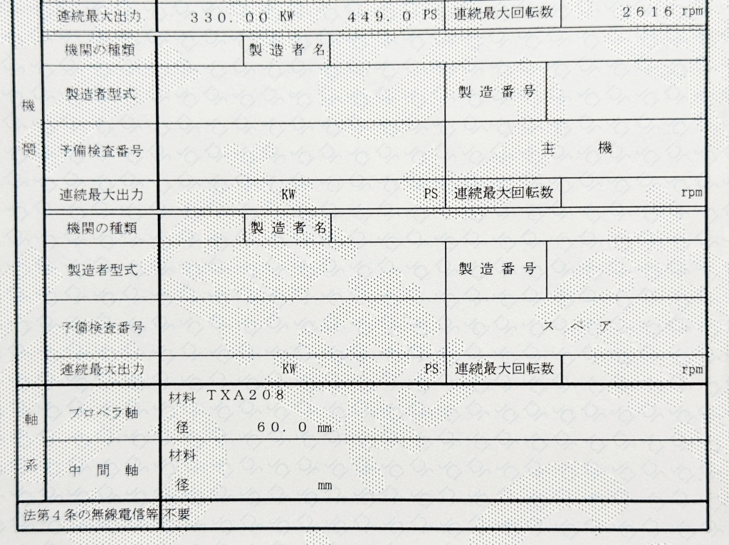 | 船検証記載馬力 | 449馬力 | 推進機器種類 | シャフト船 |