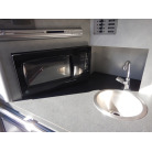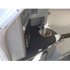 左舷側には小さなギャレーと冷蔵庫、TVがあります。