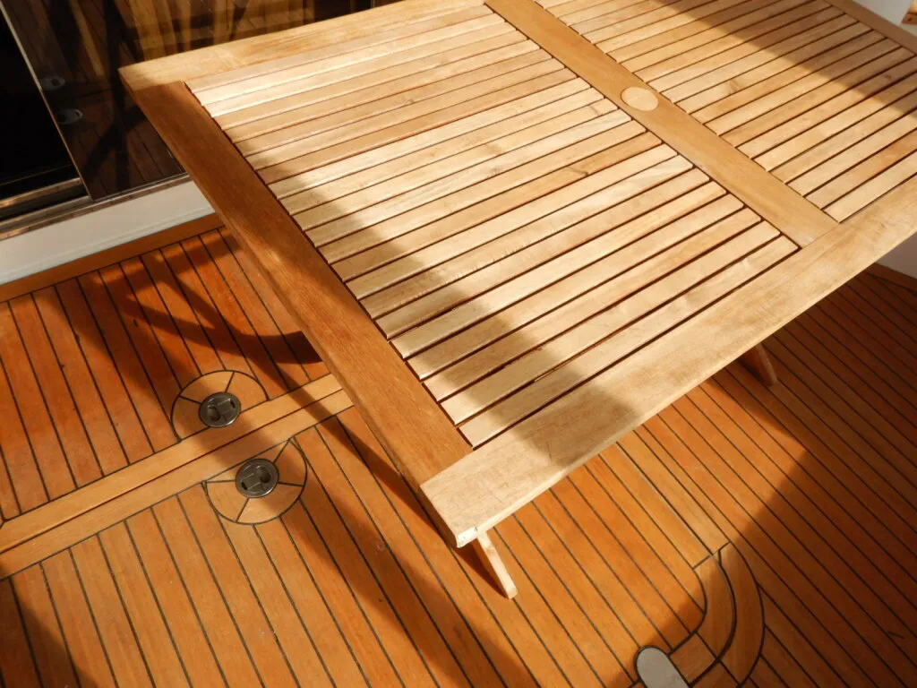 スイミングデッキから続くアフトデッキはチークがきれいで、BBQも行える十分なスペースがあります。