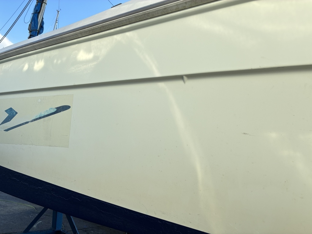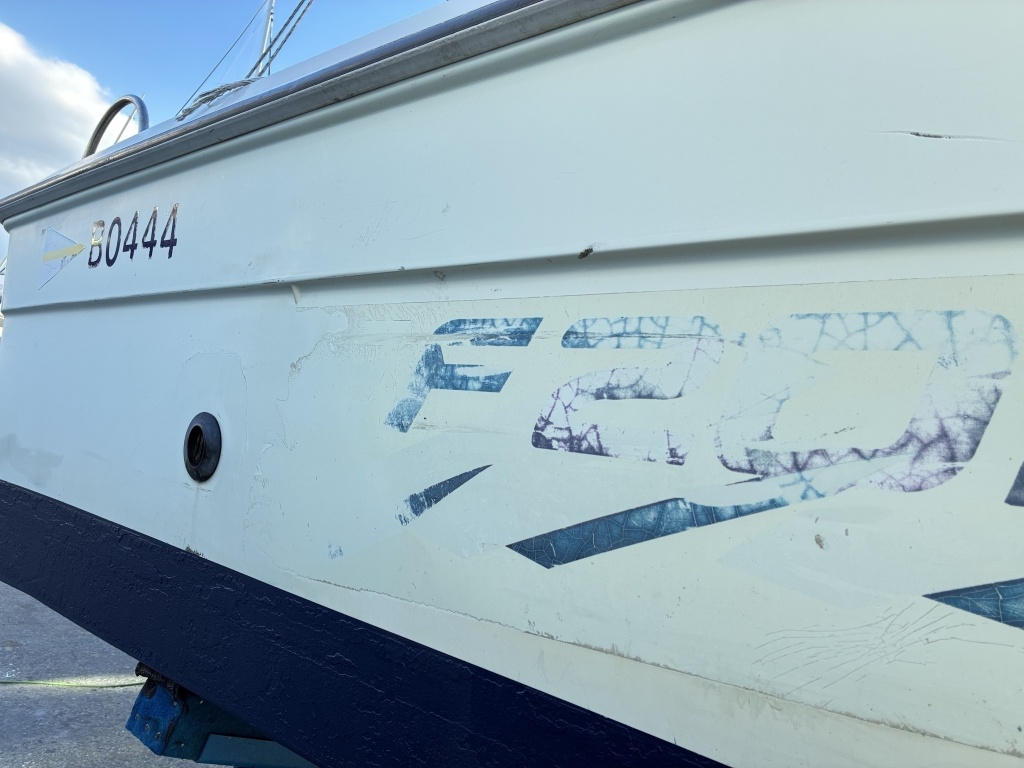 ハル周りの状態としては、使用に伴う小キズや汚れ、ならびにモデルステッカーの色褪せが見受けられます。