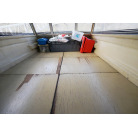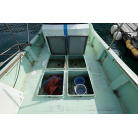 操舵席の下をくぐると備品などを収納できるスペースがあります。床板をはぐるとエンジンルームです。