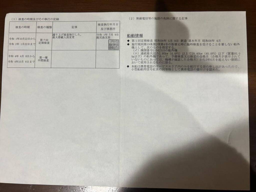 | 船検証記載馬力 | 40馬力 / 5,500rpm(回転数) | 推進機器種類 | 船外機 |