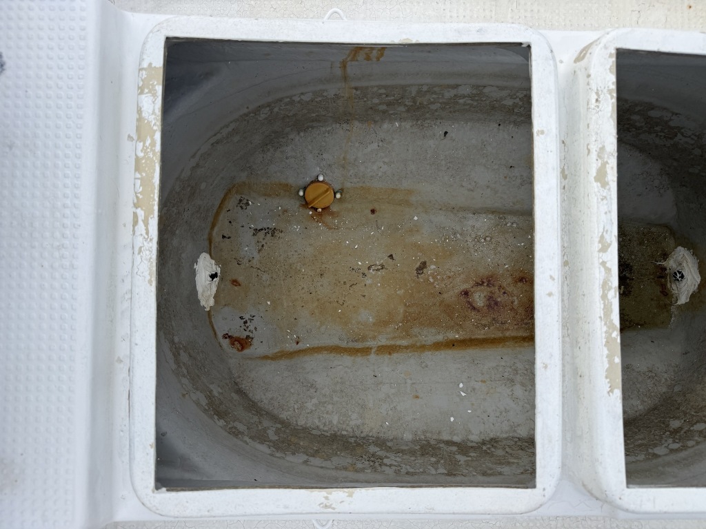 年数経過しているため多少の小傷や汚れが所々に見られ、デッキの塗装面のひび割れや剥がれを確認しました。これは、FRPのクラックではなく塗装面のひびですので、雨漏れの心配はありません。気になるようでしたら、再塗装を実施してください。