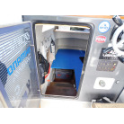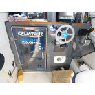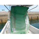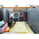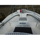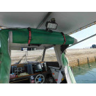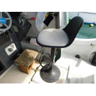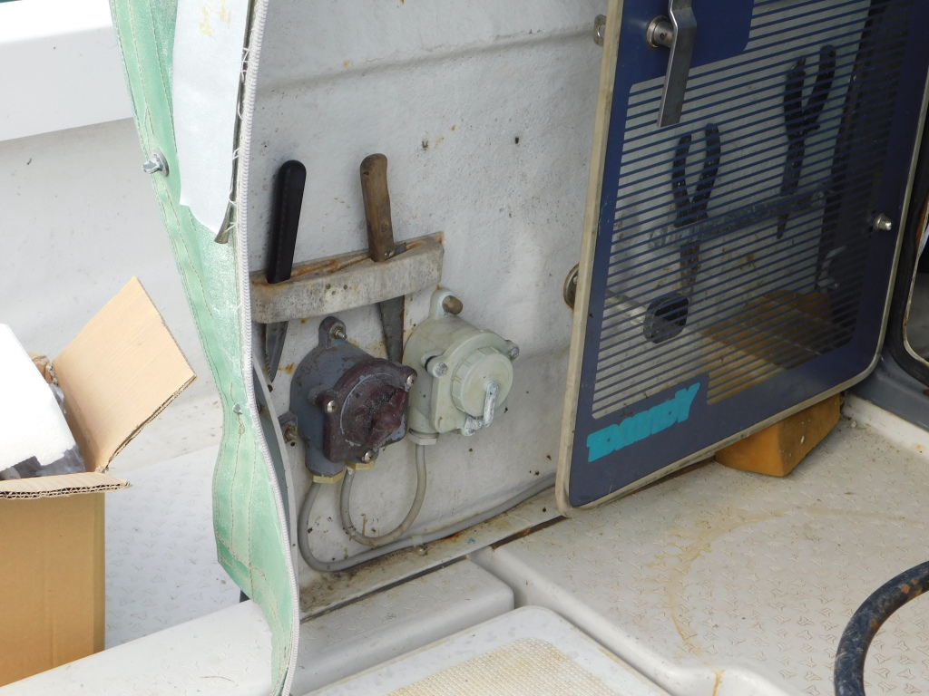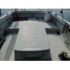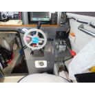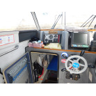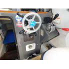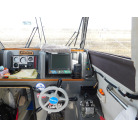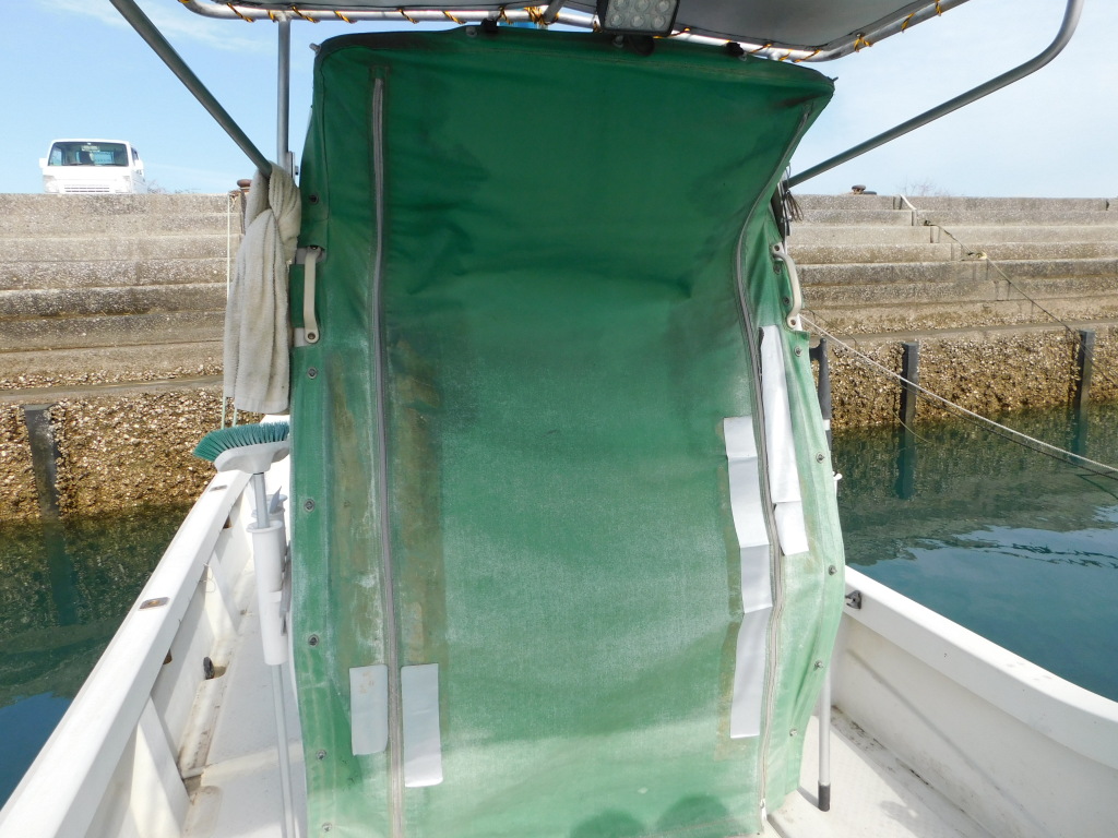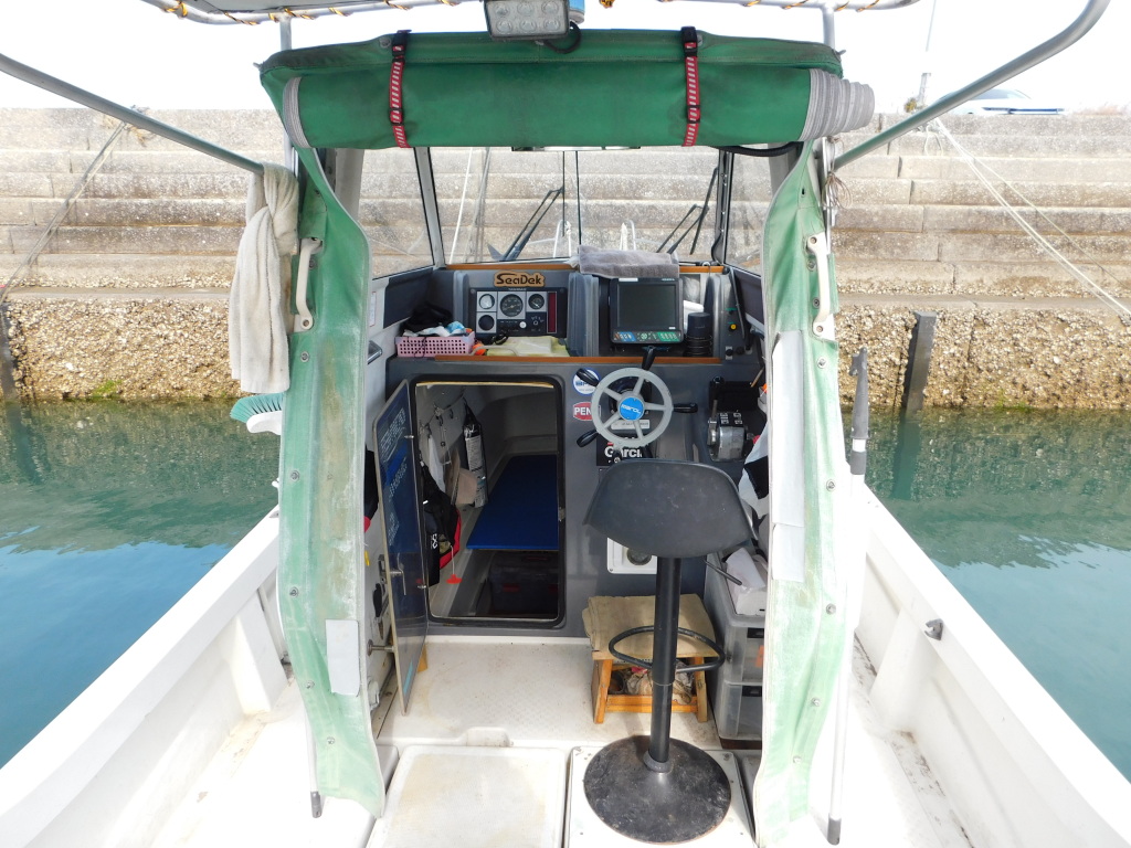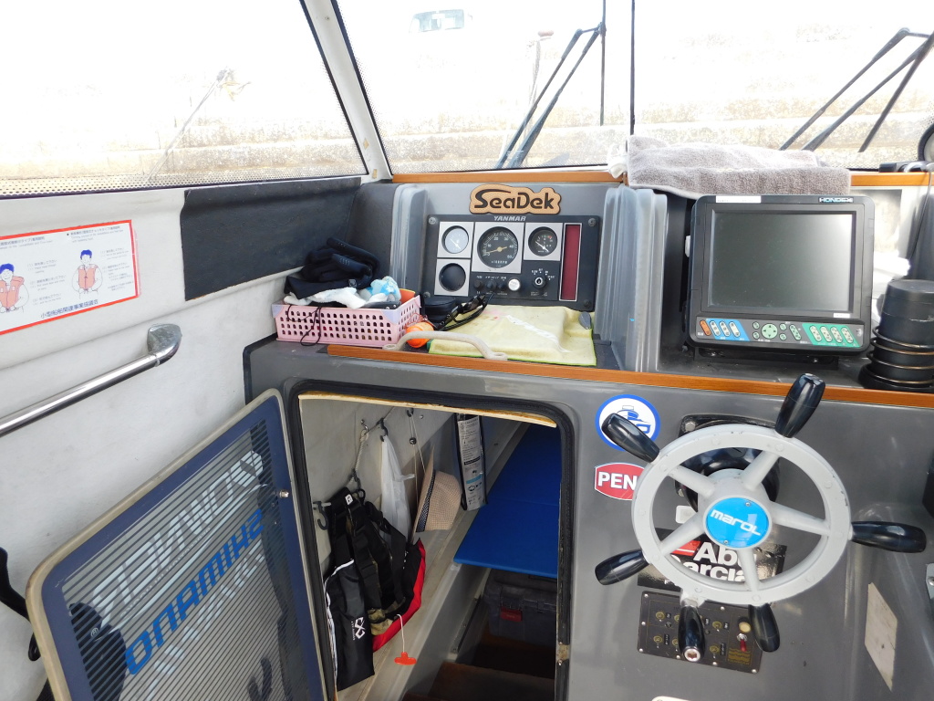 操打席は窓が大きく視界もよくすっきりとしています。HONDEXのGPS魚探が設置されています。計器類やハンドル回りもきれいに保たれています。エンクロージャーは補修されていますがファスナーもしっかりと動いています。