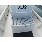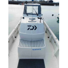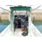 後部デッキには十分なスペースがあり、生け簀と電動リールの電源、しっかりとした造りのオーニングも設置されています。