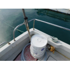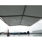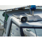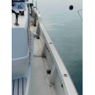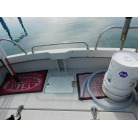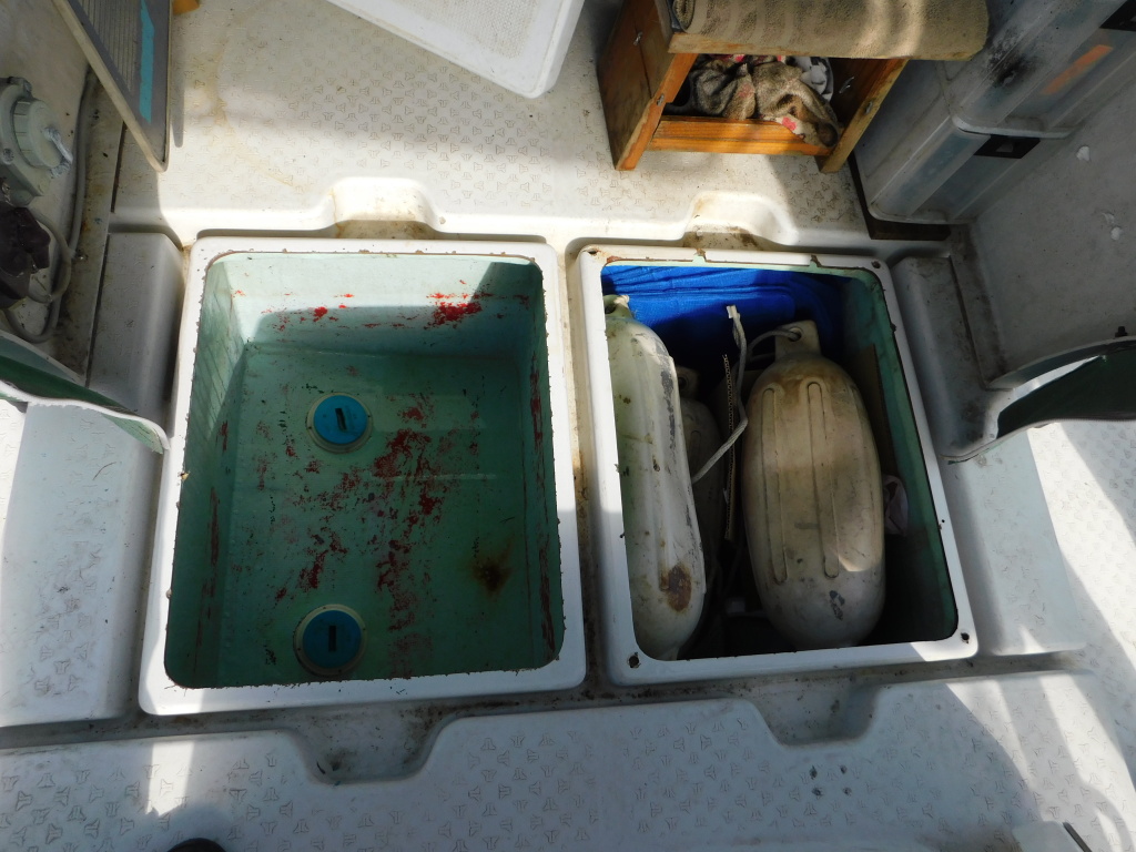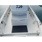 デッキ周りはしっかりとしていて、ブワついたようなところはありません。後部キャビンは広々として釣りや作業にも良さそうです。電動リールの電源とイケスがあり、しっかりとしたオーニングも設置されています。