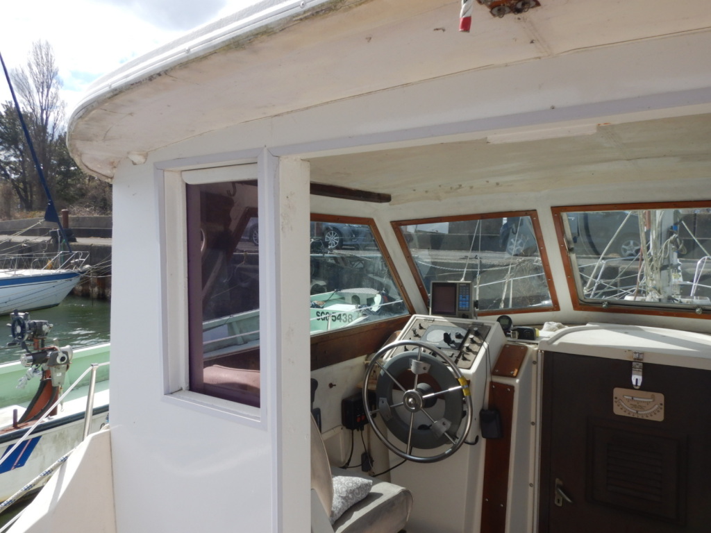 操船は、キャビン内でボートの様にシートに座り操船します。