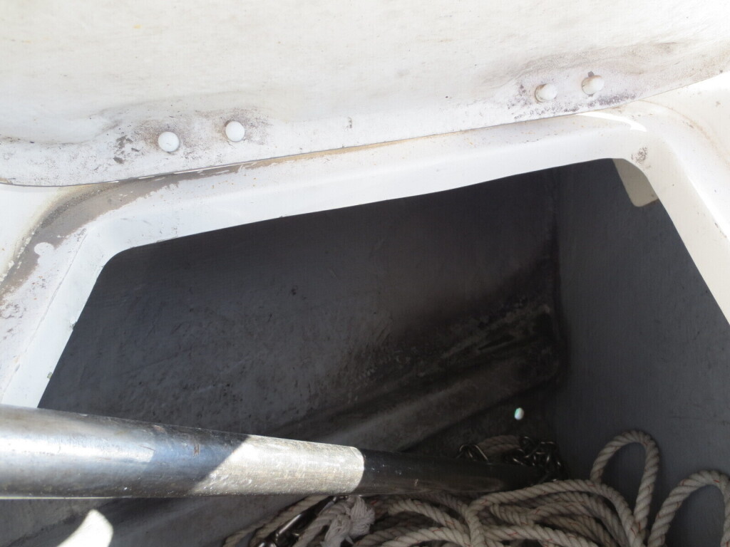 左舷側より出入りする前方室があります。現在は釣り道具の保管に使用されています。特に指摘するような水漏れ箇所は無さそうです。