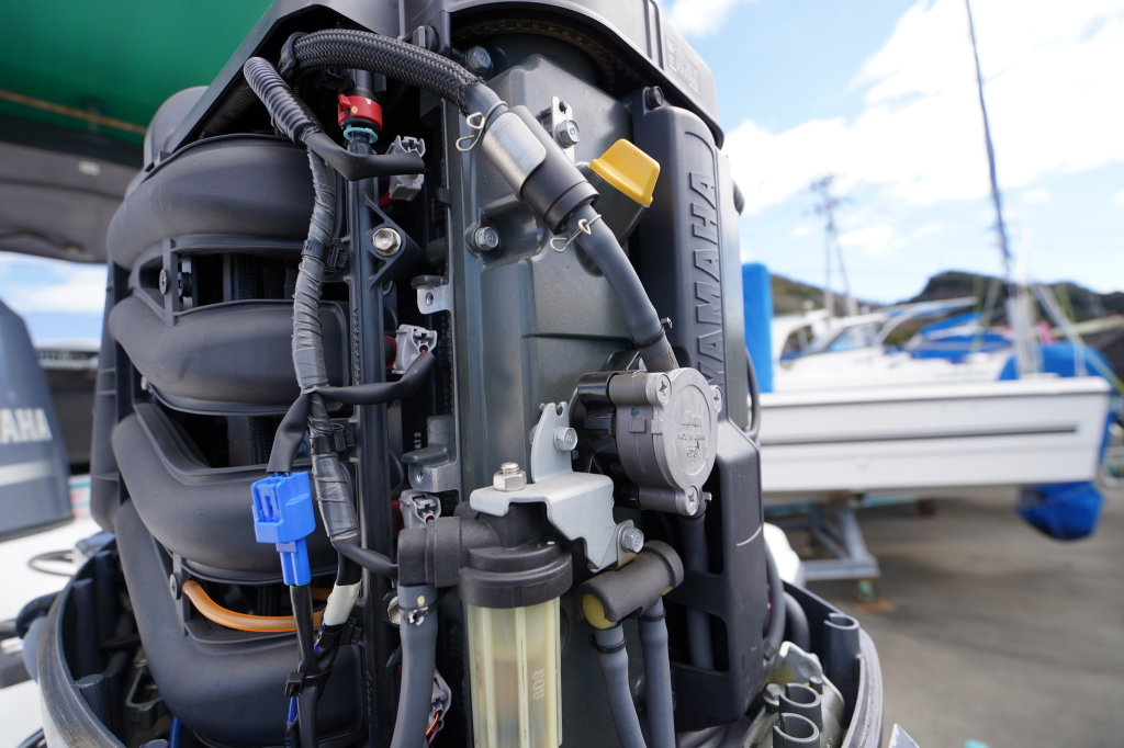 主機はヤマハ製90馬力船外機です。船体とのバランスや燃費の良さがメリットとなります。