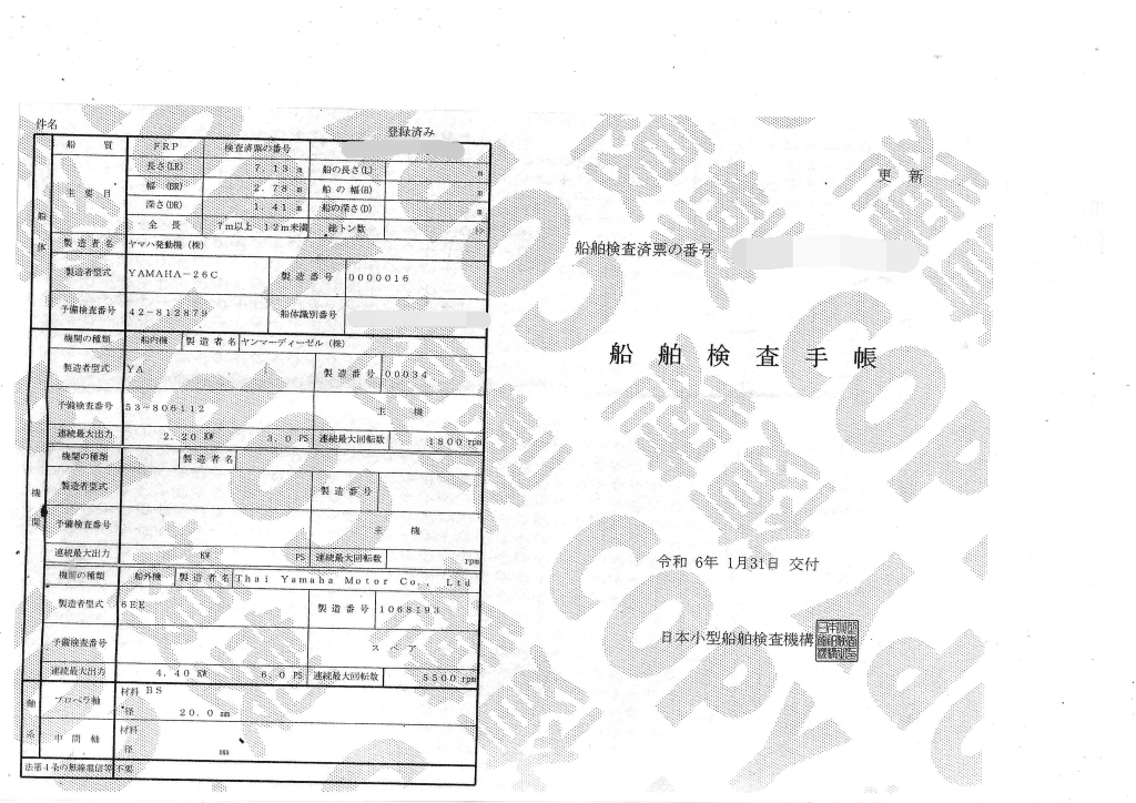 | 船検証記載馬力 | 3馬力 / 1,800rpm(回転数) | 推進機器種類 | シャフト船 |