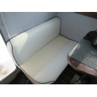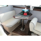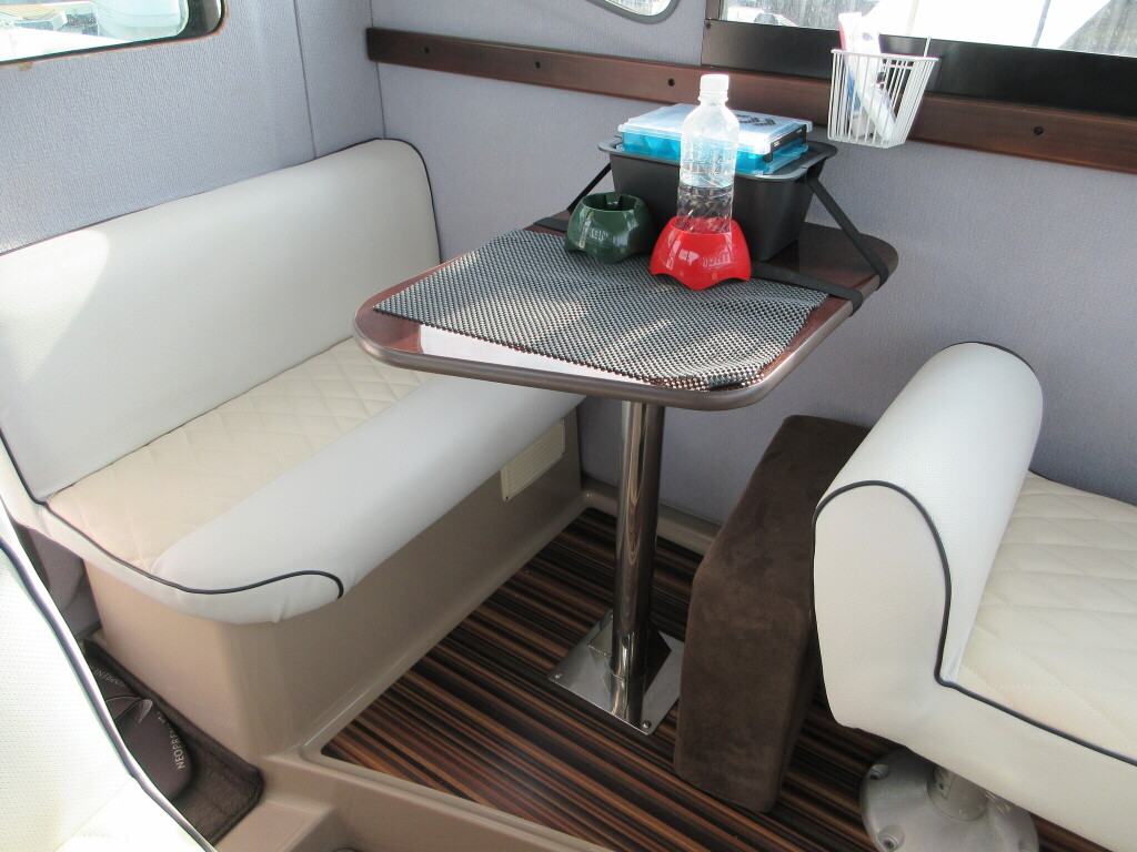 左舷側前部に助手席シート、後部にテーブルと2人掛けのゲストシートがあります。