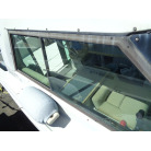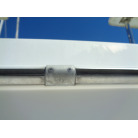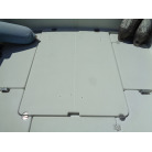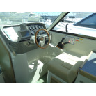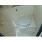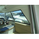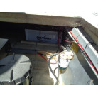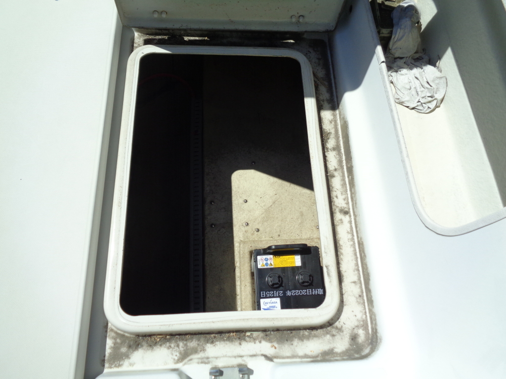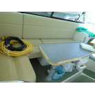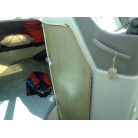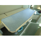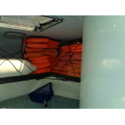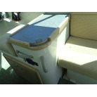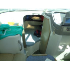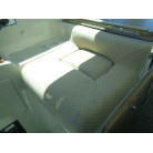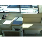 左舷側にL字型ソフアーと長めのテーブル、右舷側は操船席と短めのソフアーが置かれています、汚れや破れた所は無いようでしたが、若干経年に依る退色感が見られました。