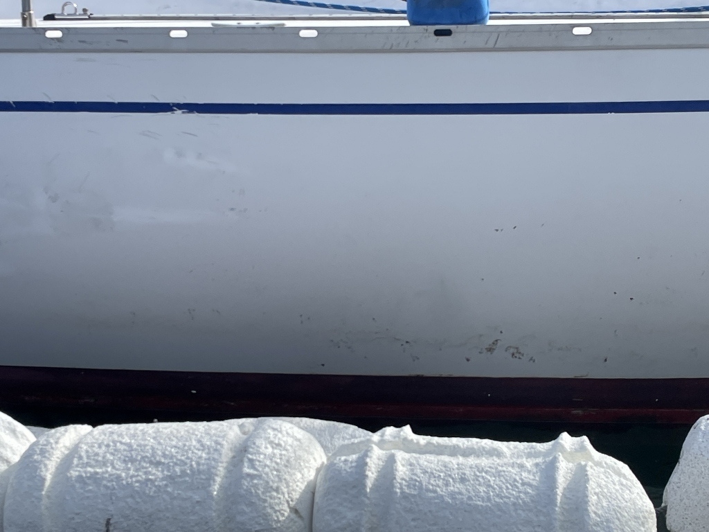 ハル、ガンネルなどの船船体は全体的に小傷、小汚れが散見されます、ロープのコスレ跡やフェンダーの汚れが付いたようです、簡単な掃除などで目立たなくなると思います。