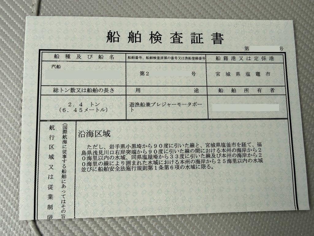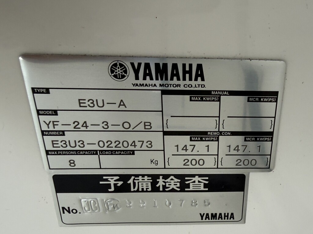 | 船検証記載馬力 | 175馬力 / 5,500rpm(回転数) | 推進機器種類 | 船外機 |