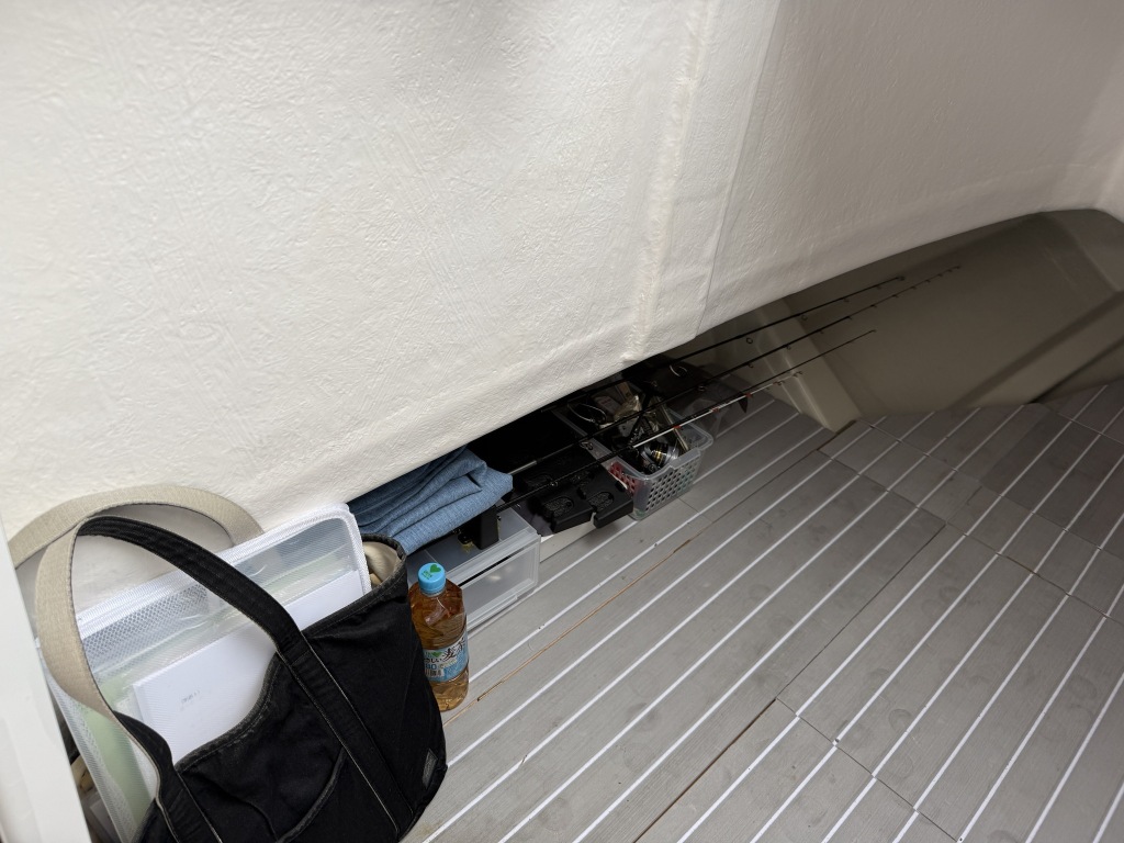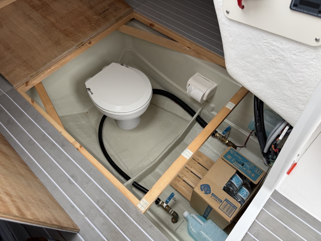 床板を外すとマリントイレが設置されています。その他、空きスペースは収納庫として活用出来そうです。