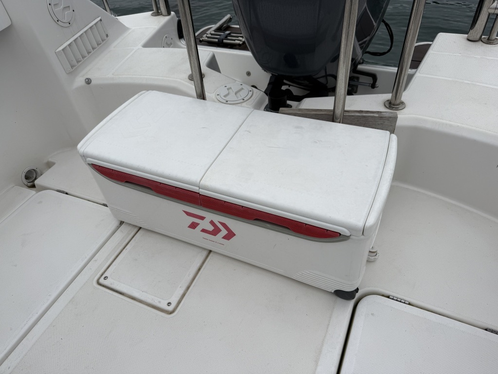 付属品として、バウデッキにミンコタ製iパイロット、アフトデッキにオーニング、椅子代わりに使用できるクーラーBOXとRVBOXが付属します。付属品コーナーの画像をご覧ください。